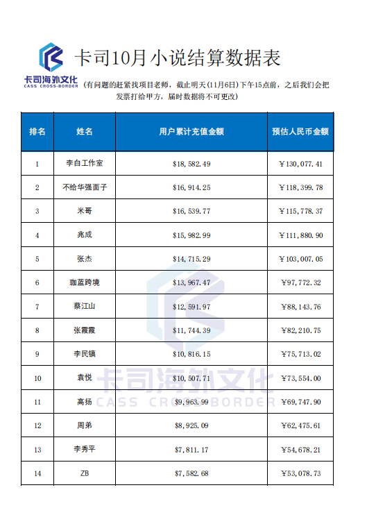 卡司小说项目通知:@所有人 10月份的小说数据结算开始打款啦!!
